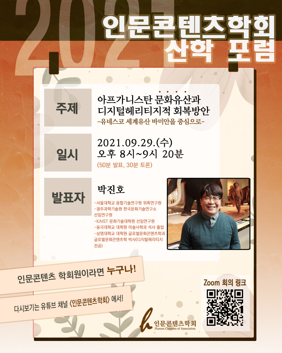 9월 29일 수요일 20시에 진행하는 2021 인문콘텐츠학회 산학 포럼 안내공지 입니다.