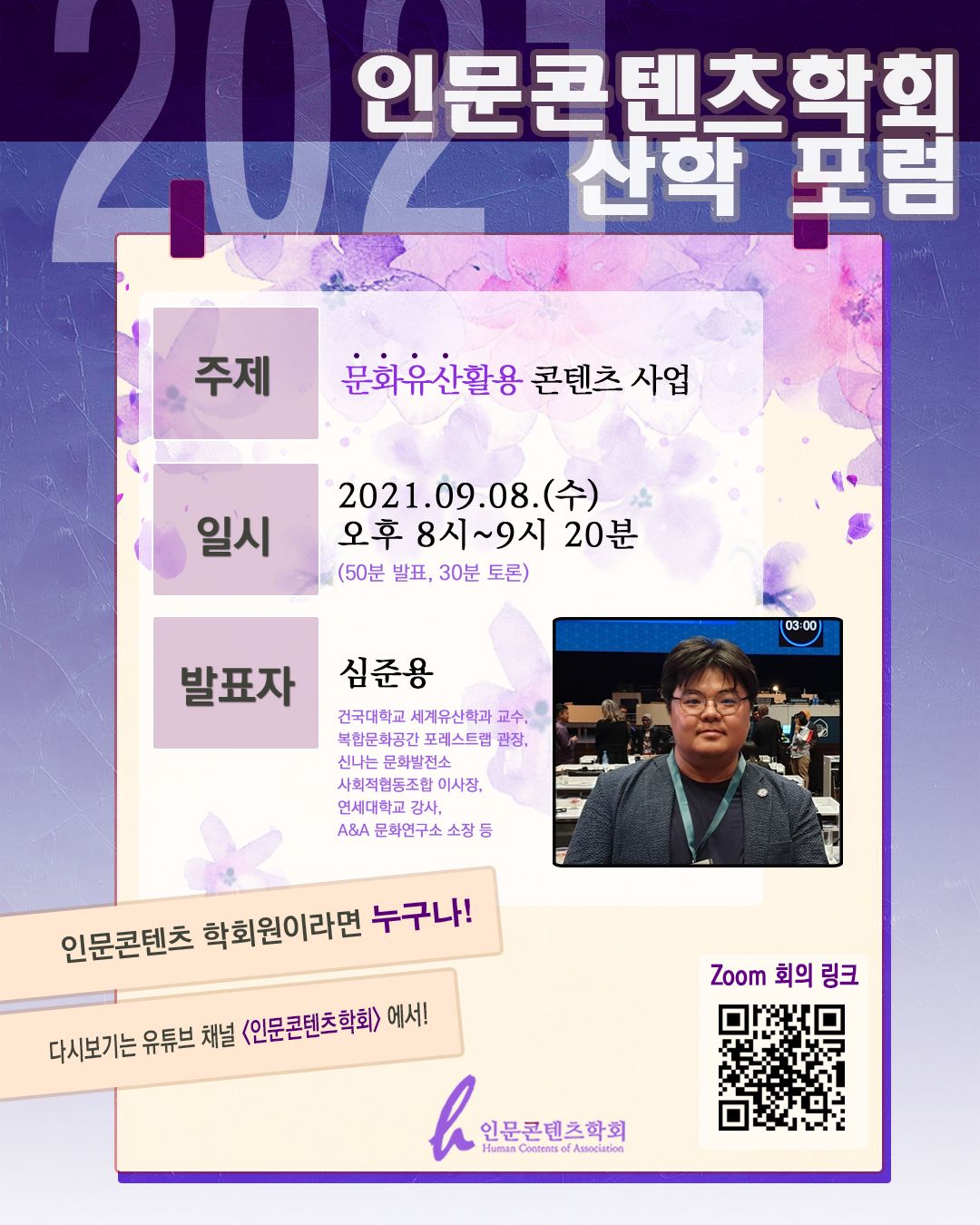 9월 8일 수요일 20시에 진행하는 2021 인문콘텐츠학회 산학 포럼 안내공지 입니다.