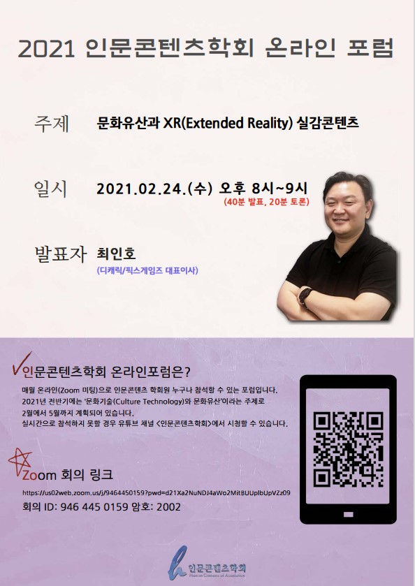포럼 진행일이 하루 앞으로 다가옴에 따라 2월 24일 수요일 20시에 진행하는 2021 인문콘텐츠학회 온라인 포럼 안내공지 및 발표자료를 첨부합니다.